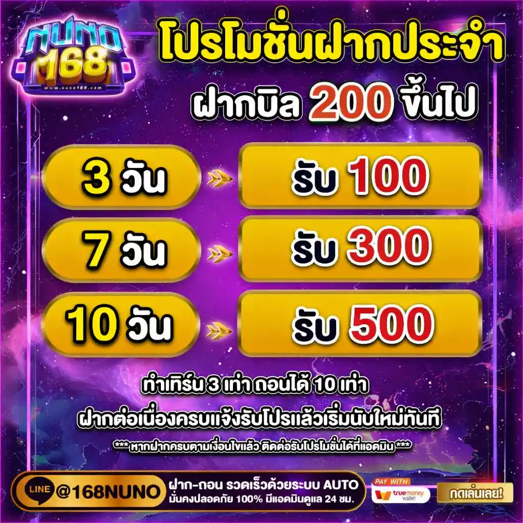 “ประทับใจระบบฝากถอน AUTO มากครับ ทำรายการไวไม่ต้องรอนาน ส่วนตัวชอบโปรฝากต่อเนื่อง 10 วันมาก เพราะผมแวะมาเล่นทุกวันอยู่แล้ว พอครบกำหนดก็ได้โบนัสฟรีมาเป็นทุนต่อยอด ถอนได้จริงไม่มีกั๊กเลยครับ”