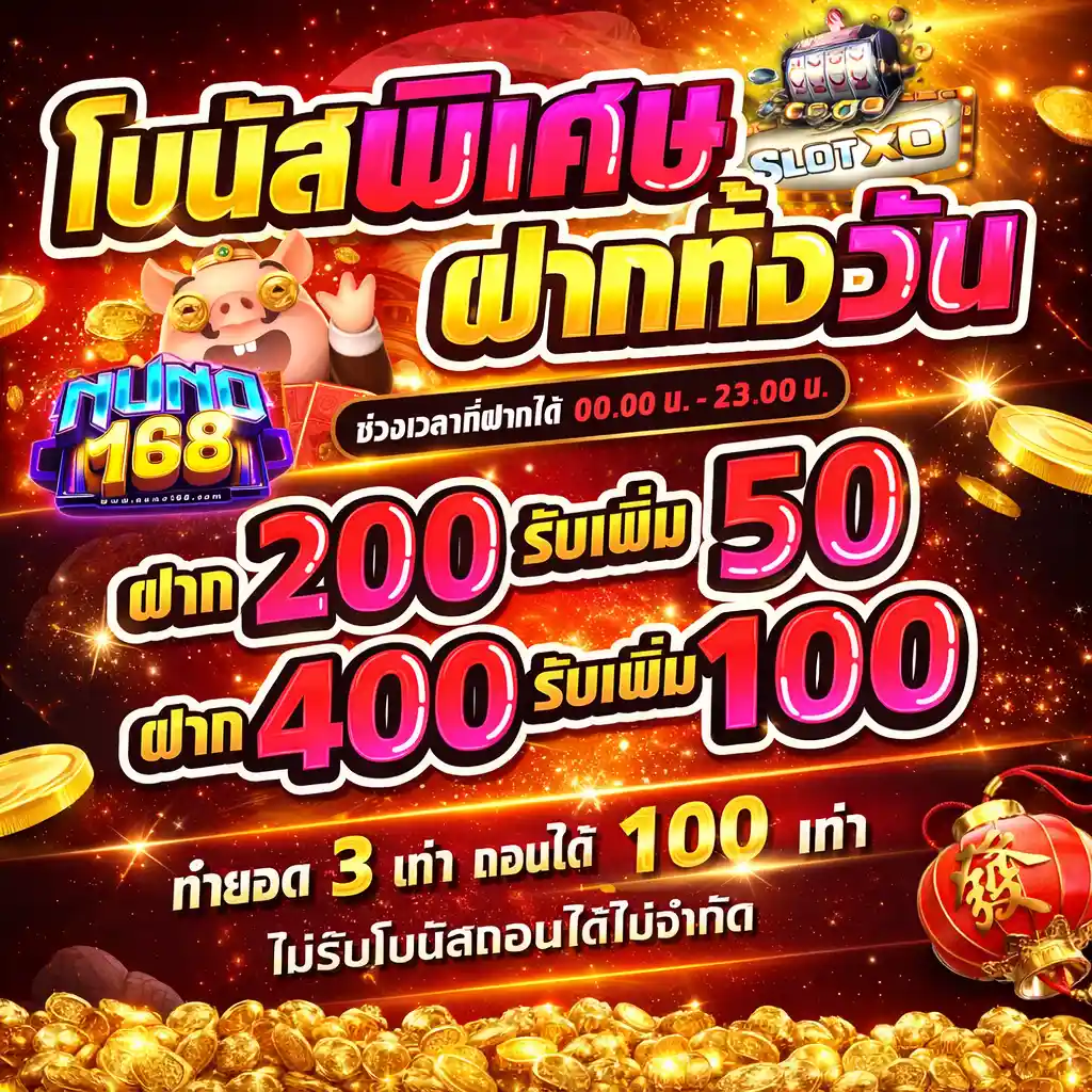• เงื่อนไข: ต้องทำเทิร์นโอเวอร์ 3 เท่าของยอดฝากรวมโบนัส และถอนได้สูงสุดถึง 100 เท่าของยอดที่ได้รับ